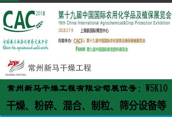 第十九届中国国际农用化学品及植保展览伙/span>CAC2018于今日(3朇/span>7日)在上海新国际博览中心拉开帷幕。据悉,将来?/span>30个国家和地区的近1400家企业参展。常州新马干燥工程有限公司亮相此展,届时将在W5K10展位现场展示高速离心喷雾干燥机等拳头产品、/span>