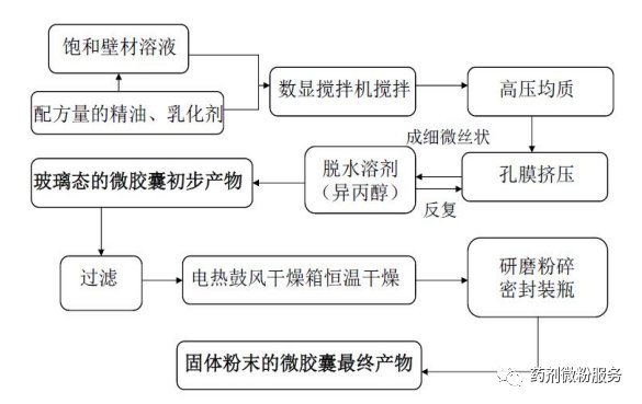 首先配置壁材饱和水溶液,再添加入精油和乳化剂,进行均质乳化,最后使液体混合物,经过一系列孔膜的作用,并将其挤进一种脱水溶剂(通常为异丙醇)中。当被孔膜挤压出来的乳状液接触到脱水溶剂,此时壁材也会随之脱水硬化,并包覆在芯材的表面。经过过滤,将微胶囊粗产品从脱水溶剂异丙醇中分离,即可得到玻璃态的包埋产 物;也可以继续进行干燥研磨,得到粉末状的包埋产物。