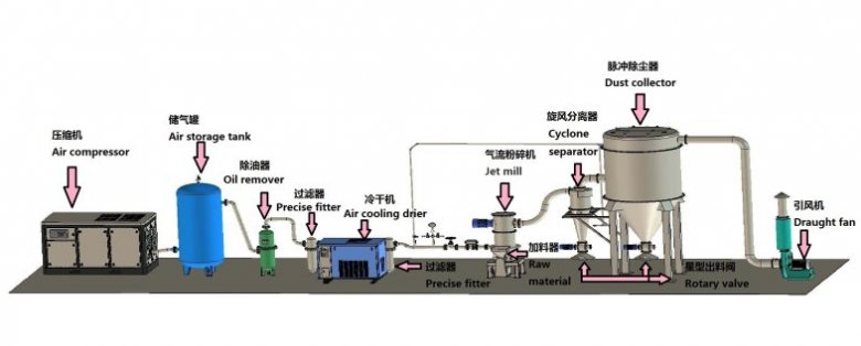 气流磨是一种用高速气流来实现干式物料超微粉碎的设备,它由粉碎喷嘴、分级转子、螺旋加料器等组成,物料通过螺旋加料器进入粉碎室,压速空气通过特殊配置的超音速喷嘴向粉碎室高速喷射,物料在超音速喷嘴射流中加速,并在喷嘴交汇处反复冲击、碰撞,达到粉碎。被粉碎物料随上升气流进入分级室,由于分级转子高速旋转,粒子既受到分级转子产生的离心力,又受到气流粘性作用产生的向心力,当粒子受到离心力大于向心力,即分级粒径以上的粗粒子返回粉碎室继续冲击粉碎,分级粒径以下的细粒子随气流进入旋风分离器、捕集器收集,气