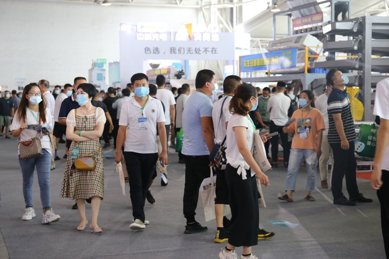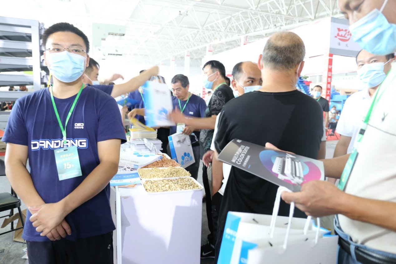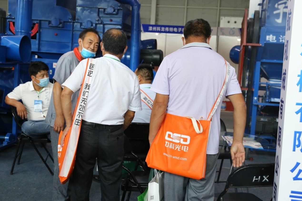 参展者身背中科光电背包,醒目的橘黄色彰显中科人对色选事业的热情与活劚/p>
