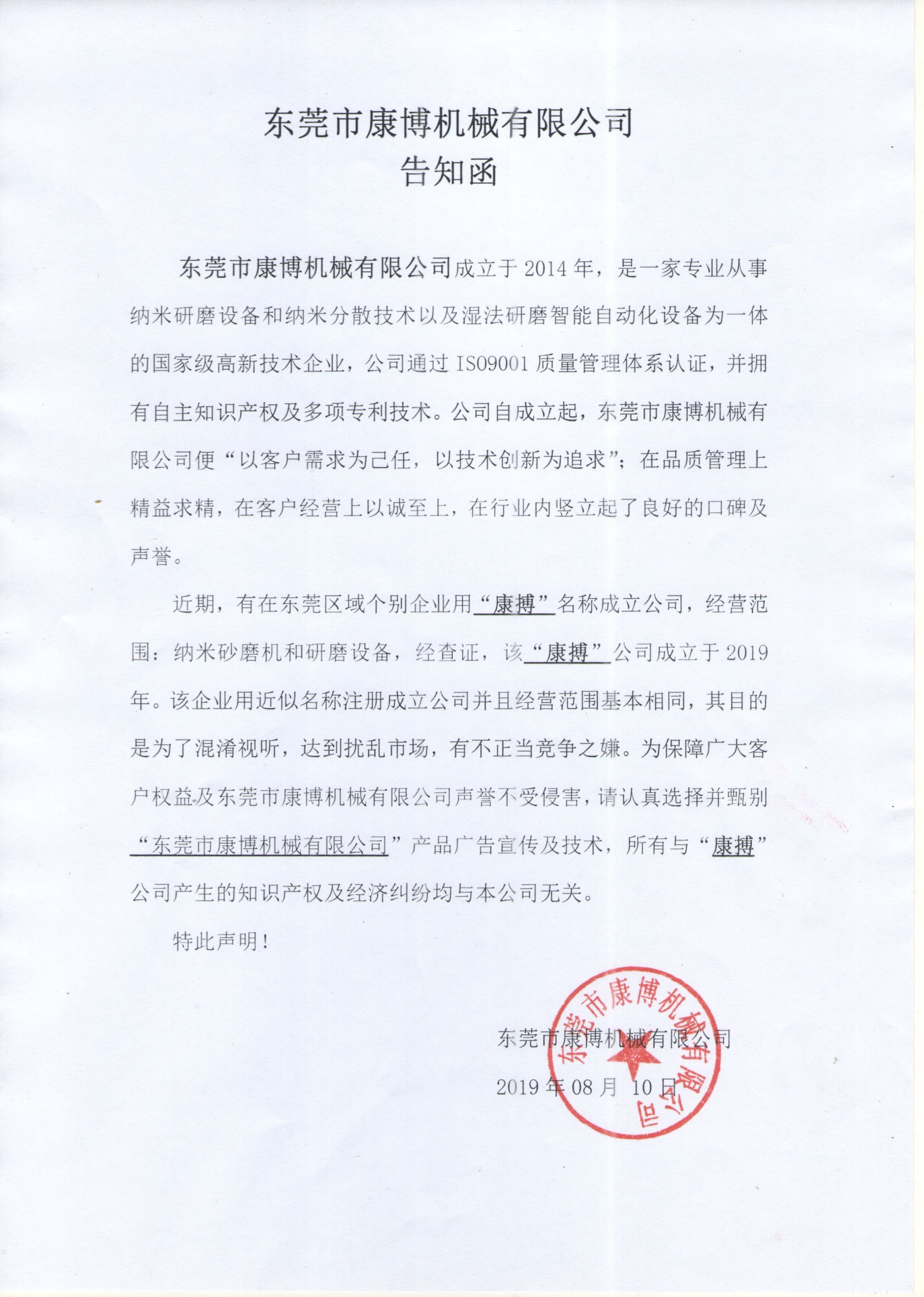 近期,有在东莞区域个别企业用‛/span>康搏“/span>名称成立公司,经营范围:纳米砂磨机和研磨设备,经查证,该‛/span>康搏“/span>公司成立亍/span>2019年。该企业用近似名称注册成立公司并且经营范围基本相同,其目的是为了混淆视听,达到扰乱市场,有不正当竞争之嫌。为保障广大客户权益及东莞市康博机械有限公司声誉不受侵害,请认真选择并甄?/span>“东莞市康博机械有限公司”产品广告宣传及技术,所有与‛/span>康搏”公司产生的知识产权及经济纠纷均与本公司无关、/span>