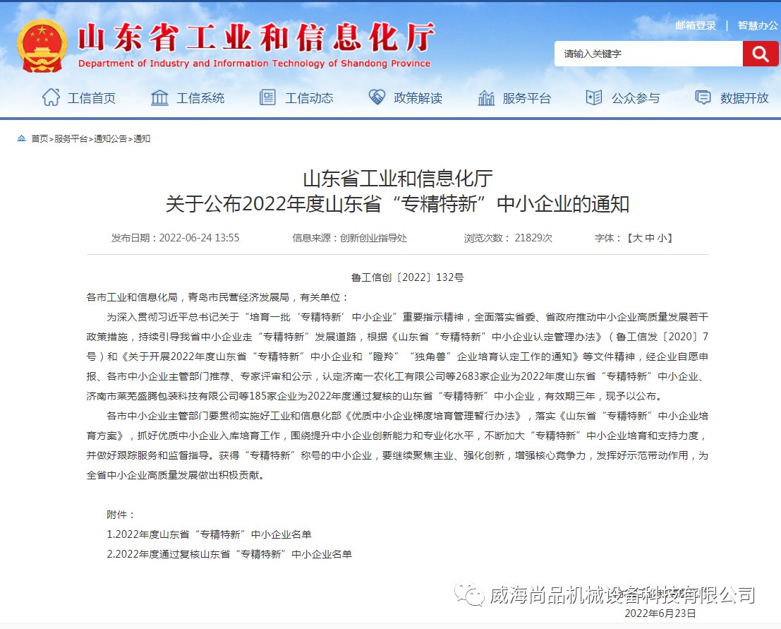 近日,威海尚品机械设备科技有限公司凭借着技术实力、创新能力及产品质量获山东省“专精特新”中小企业称号。此次获评,是对尚品科技培养技术领域人才,自主研发成果的肯定,激励尚品科技继续发挥“产、学、研”的能动作用、/p>