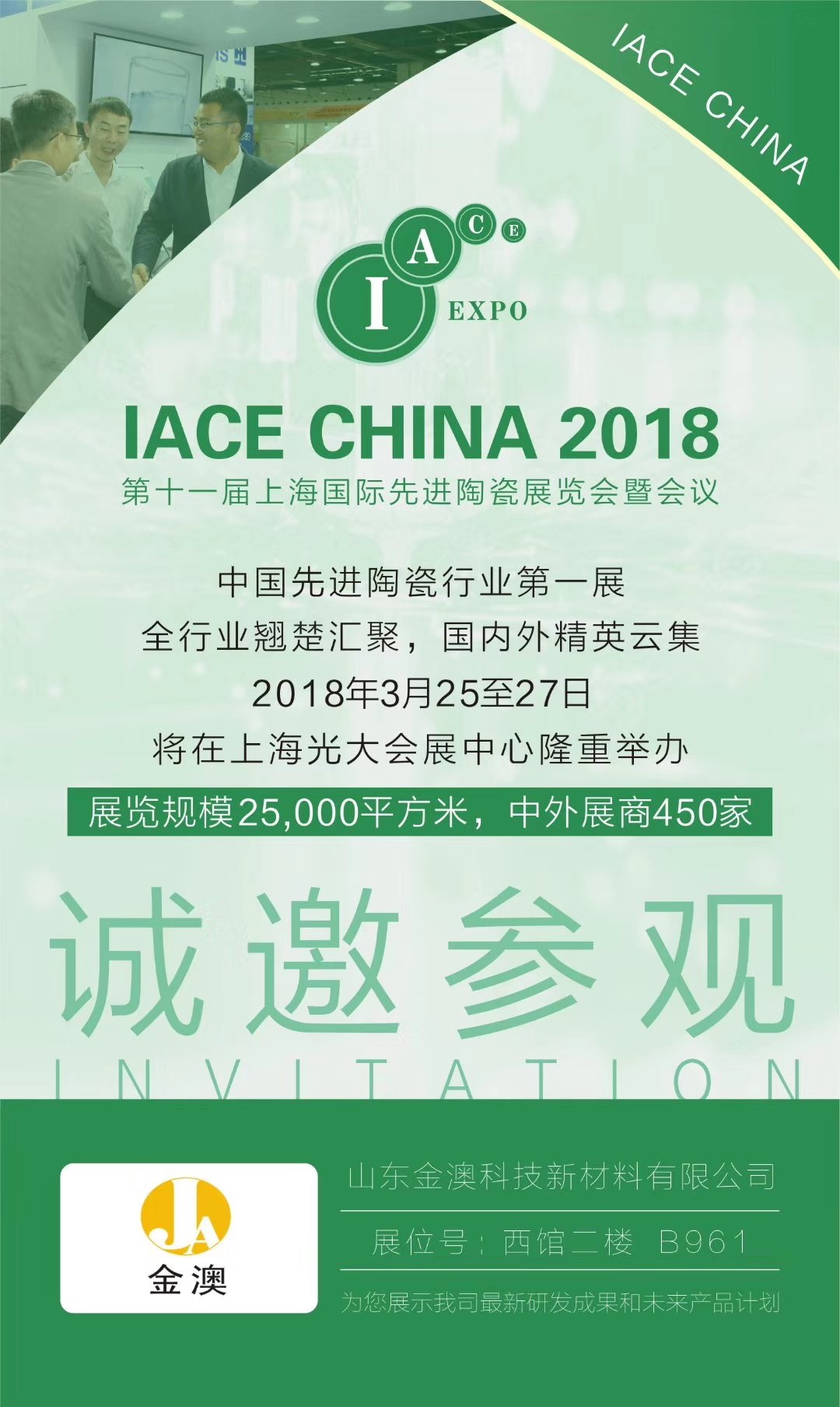 第十一届上海国际先进陶瓷展览会暨会?/span>IACE CHINA 2018将于2018平/span>3朇/span>25?/span>-27日在上海光大会展中心隆重举行,吸弔/span>450家展商参加,展览面积达到25000平米、/span>山东金澳科技新材料有限公司携氧化锆珠等产品参加此次盛会,展位号:西馆二楼B961+/span>欢迎届时莅临?/span>
