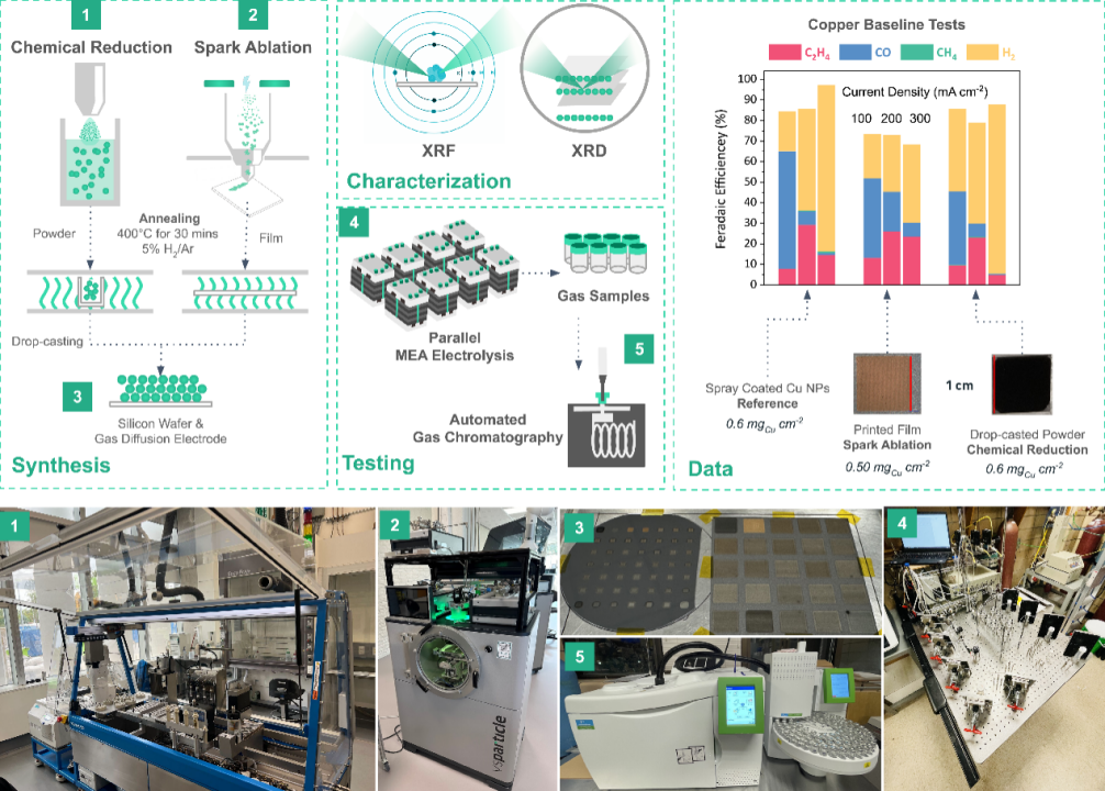 该图说明了实验流程,详细说明了从合成到表征和测试的过程。(右)两种合成技术和使用喷涂 Cu 纳米粒子的参考样品。所有技术都可以看到电流密度的类似趋劾/p>