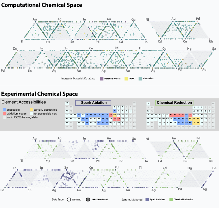 (上)考虑到用于计算数据的成分多样性和综合性,映射和显示集合了MP、OQMD Alexandria的数据库源。(下)通过两种合成方法(化学法 VSP 火花烧蚀)描述元素的可行性,以及所有实验合成、表征和测试样品的Chemical Space。较深阴影的三元相图是由多个图连接而成的,该项目未进行探索