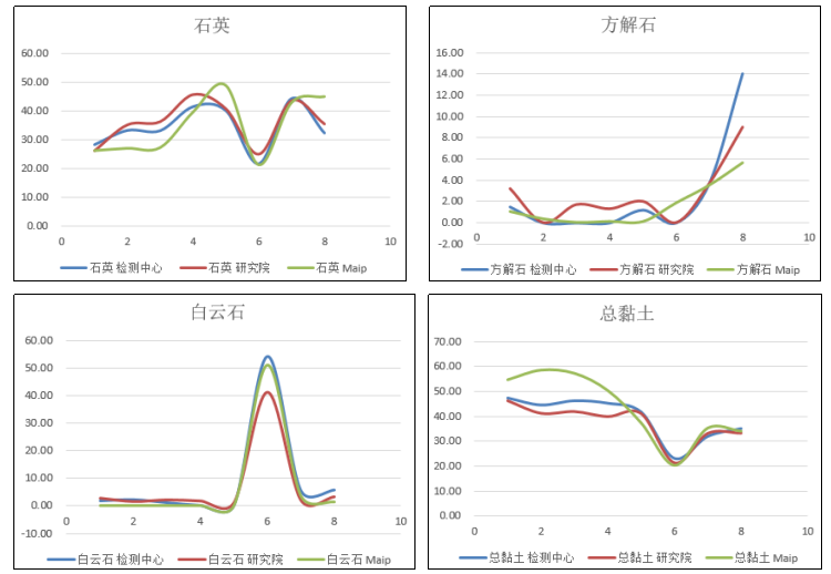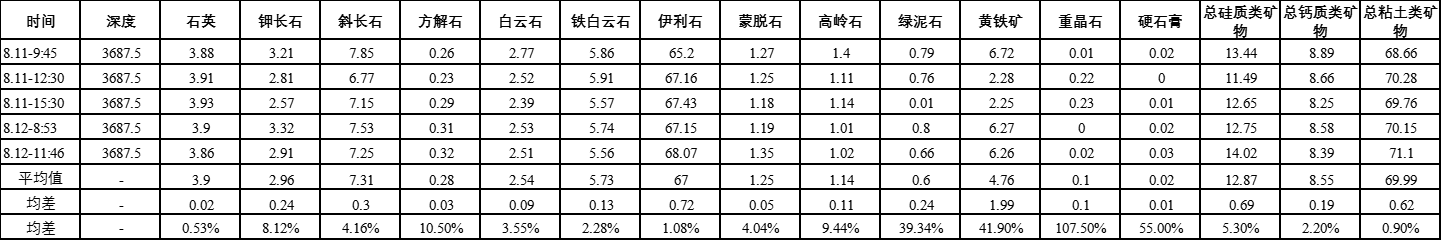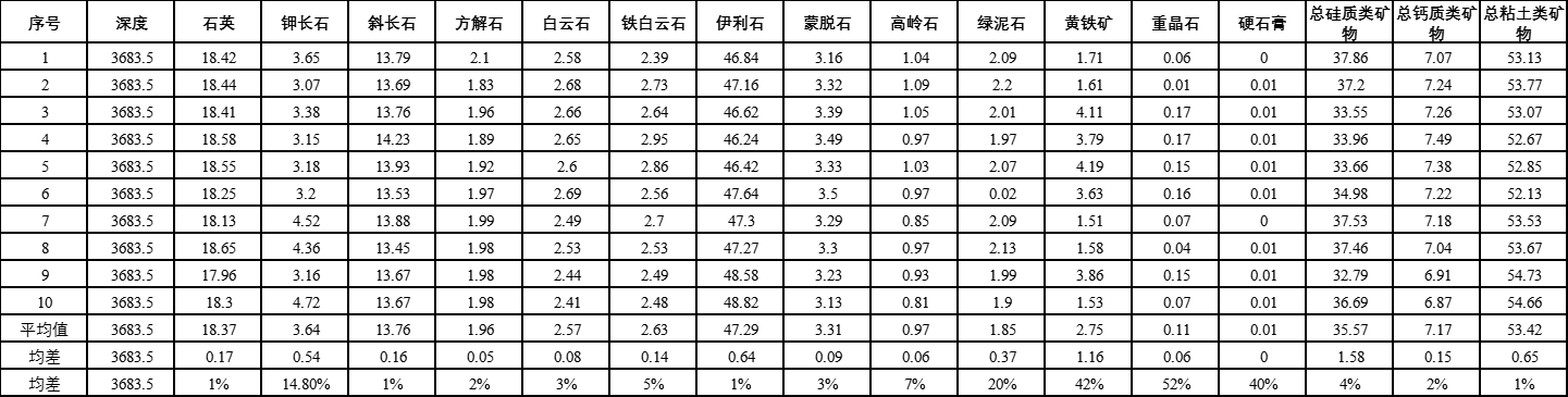 实验结果:整体重复性良好,对含量超?%的矿物上下浮动一般不超过6%;元素分析结果整体重复性较好,对含量超?%的元素上下浮动一般不超过5%;矿物稳定性分析结果显示,对于含量大于5%的矿物,整体稳定性较好;总硅质矿物、总钙质矿物、总黏土矿物稳定性较好,上下浮动不会超过5%;其它矿物如黄铁矿、重晶石等出现较大变化,原因有三点:①这些副矿物分布不均,非均质性强(如黄铁矿条带);②矿物本身含量很低,稍有起伏就显示很大的浮动率;③X-Ray采集点作用范围约1μm,而样品台的移动有1~2微米的误差,导致测试同一样品时,上一次测试与下一次测试X-Ray的采集位置并不完全相同、/span>