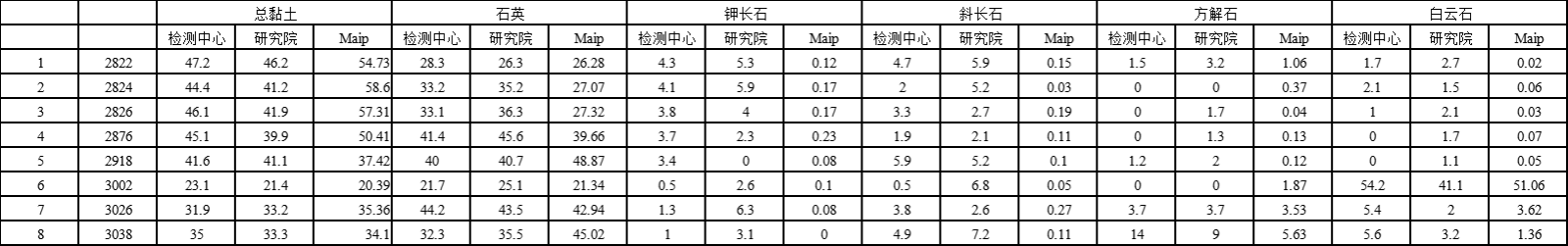同时,为保证矿物识别的准确性与严谨性,对矿物分析进行了平行对比实验,对比方法为XRD粉晶衍射,数据由录井基地地质检测中心与勘探开发研究院分别盲测提供。经对比,粘土、石英、碳酸盐等主要矿物的变化趋势基本一致,部分数据对比结果如下?nbsp;