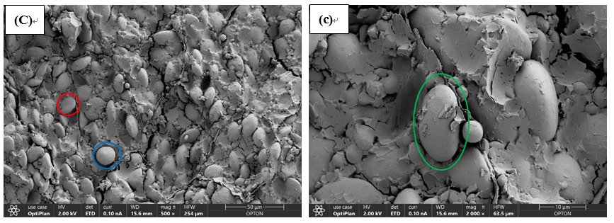 从小麦淀粉颗粒形貌上看,形态各异。有的淀粉颗粒形似铁饼,赤道线上有凹槽(?红圈所示);还有的淀粉颗粒为球形(蓝圈);肾形(绿圈)。根据淀粉形状的特征,据此可以判断所检验淀粉种类的科属类别[4]、/p>