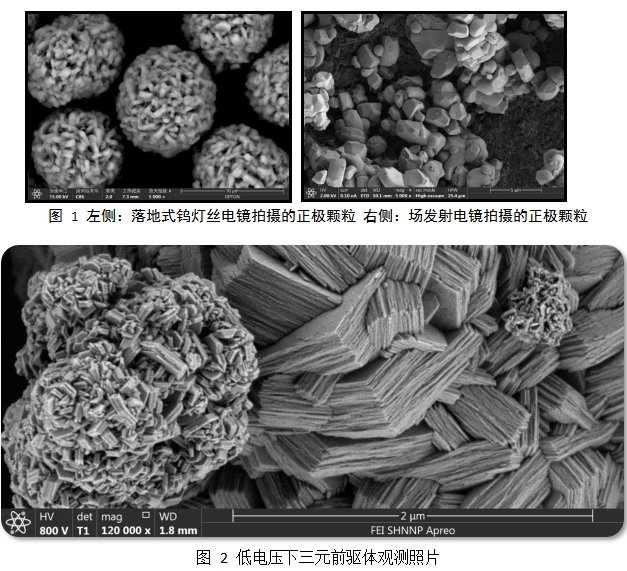 随着电池对正极要求的增加,纳米级的正极材料也应运而生。而纳米级的颗粒要获得良好的细节信息,则通常使用场发射电镜进行观察分析。这主要是场发射电镜可以在较低的电子束电压下良好成像,因为场发射的亮度更高,从而可以在低电压下激发出足量的用于分析的信号。低能的电子在样品中的相互作用区域减小,信号所反映的信息就只来自于样品表面、/span>
