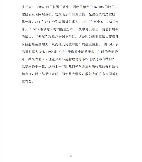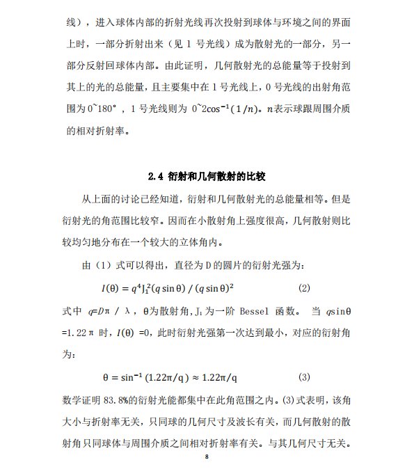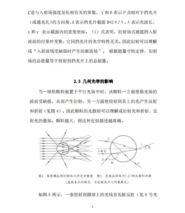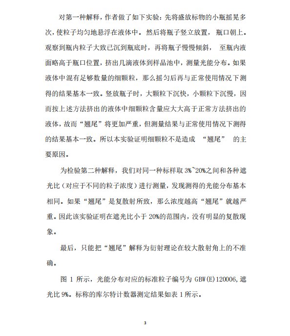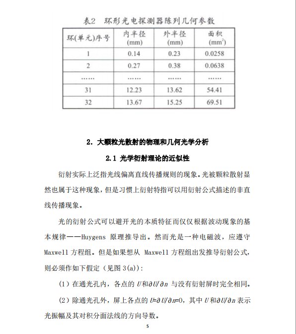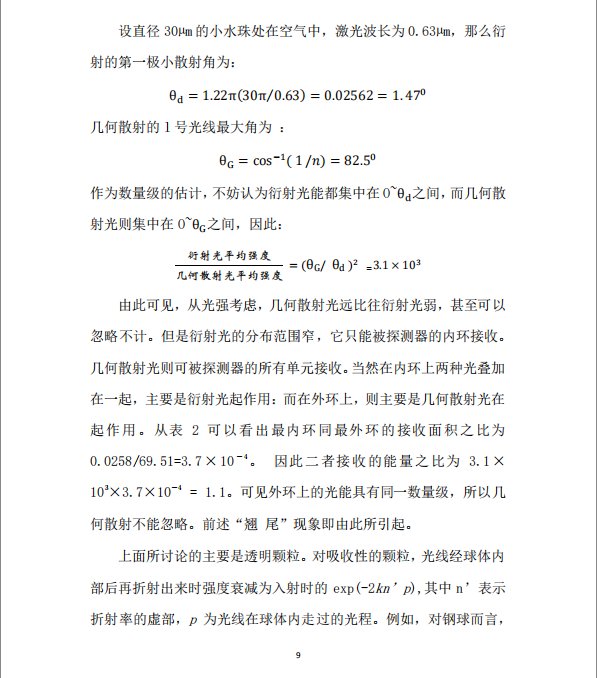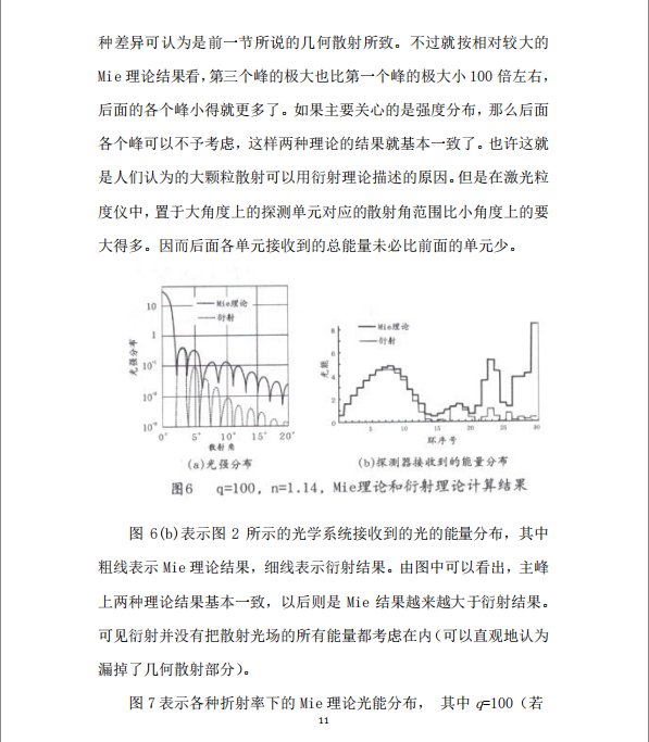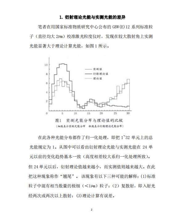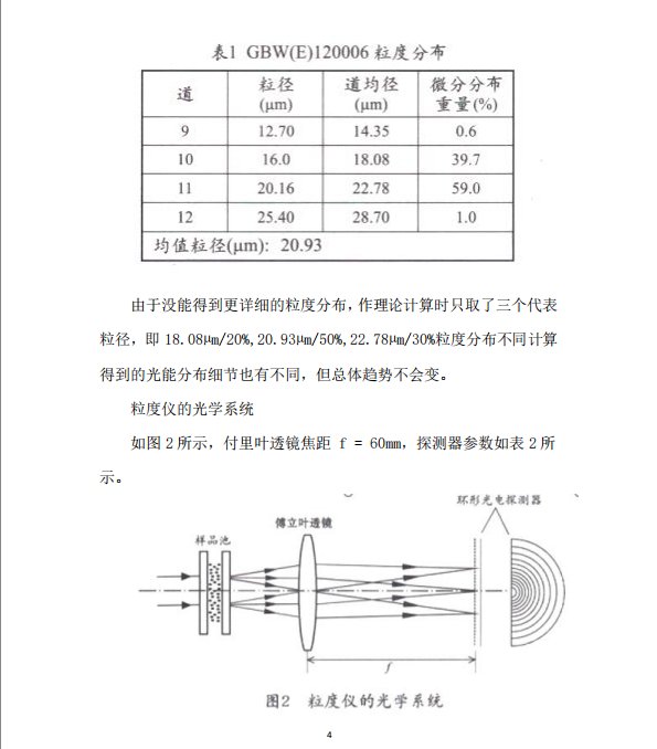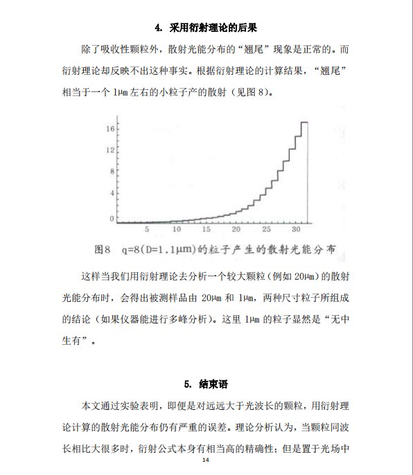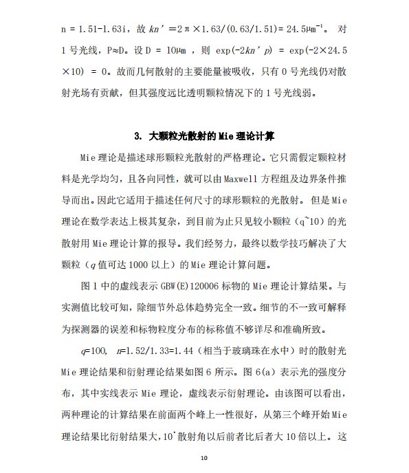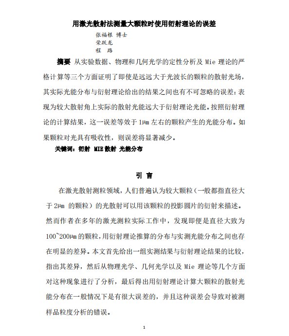 摘要从实验数据、物理和几何光学的定性分析及Mie理论的严格计算等三个方面证明了即使是远远大于光波长的颗粒的散射光场,其实际光能分布与衍射理论给出的结果之间也有不可忽略的误差:表现为较大散射角上实际的散射光能远大于衍射理论光能。按照衍射理论的计算结果,这一误差等效 1µm 左右的颗粒产生的光能分布。如果颗粒对光具有吸收性,则误差将显著减少、/span>