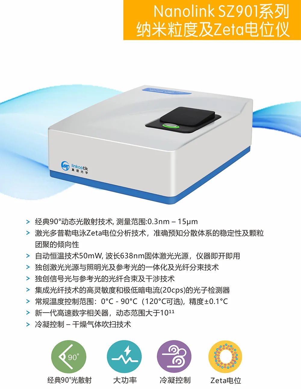 Nanolink SZ901是在SZ900基础上基于多年的科研成果开发的新一代纳米粒度和Zeta电位分析系统,采用动态光散射(DLS)和电泳光散射(ELS)原理分别进行纳米粒度测量和Zeta电位分析,被广泛应用于有机或无机纳米颗粒、乳液、高分子聚合物、胶束、病毒抗体及蛋白质等样品的颗粒表征及样品体系稳定性及颗粒团聚倾向性的检测和分析、/span>