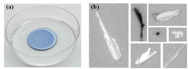 ?(a)为样品过滤到滤膜上得到的实物图,可以看到滤膜表面被浸染成蓝色,经过YH-MIP 0103显微计数法不溶性微粒分析仪对滤膜表面分析后,可以清晰地观察到滤膜表面的颗粒形貌,其中较为典型的颗粒的图片展现在?(b)中,这些膜上的颗粒将为制剂中不溶性微粒的追根溯源提供非常重要的参考意义、/p>