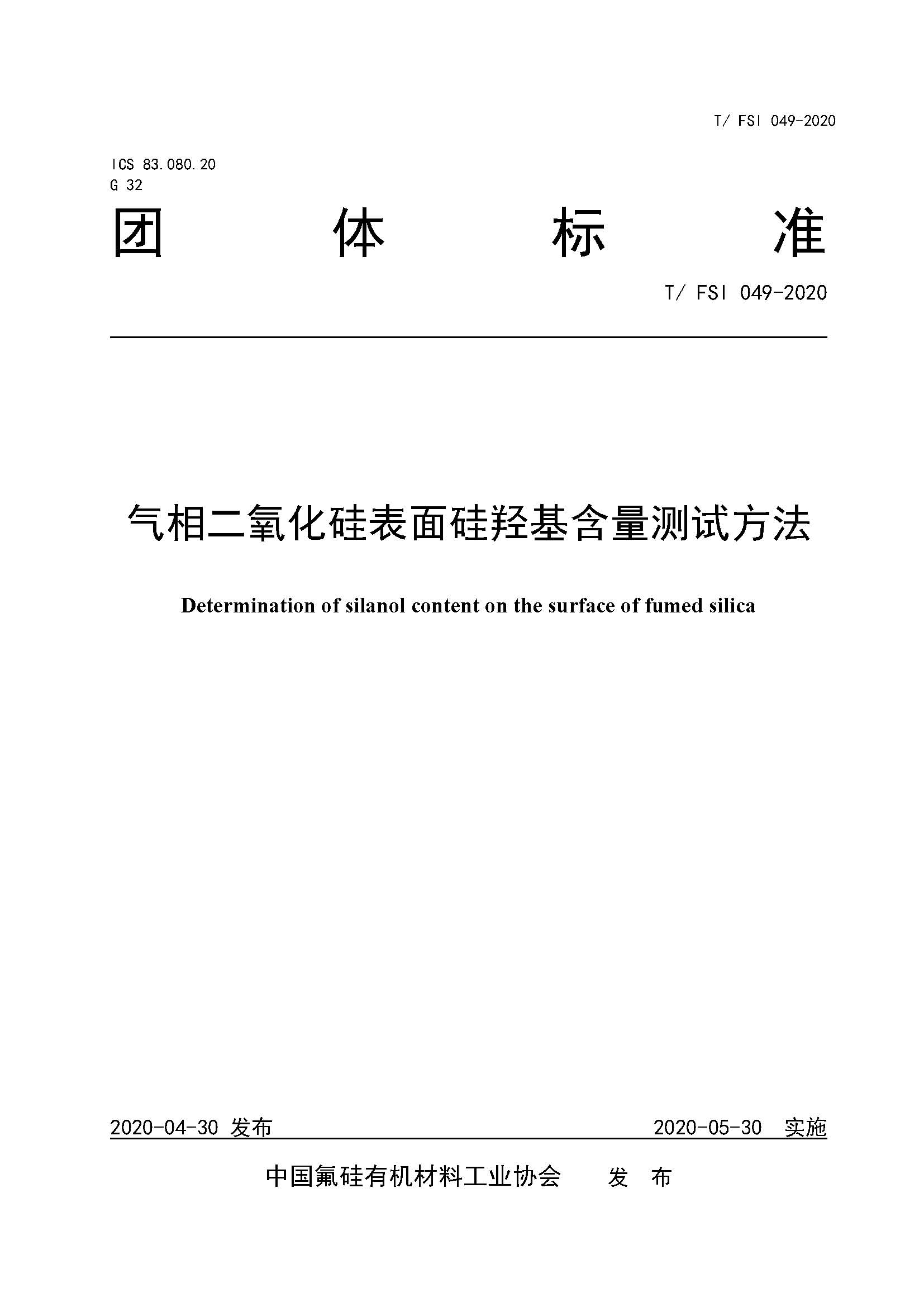 由宜昌汇富硅材料有限公司全资子公?-广州汇富研究院有限公司主持制定的团体标准《气相二氧化硅表面硅羟基含量测试方法》(T/FSI 490-2020)于2020??0日正式发布,将于2020??0日正式实施、/p>