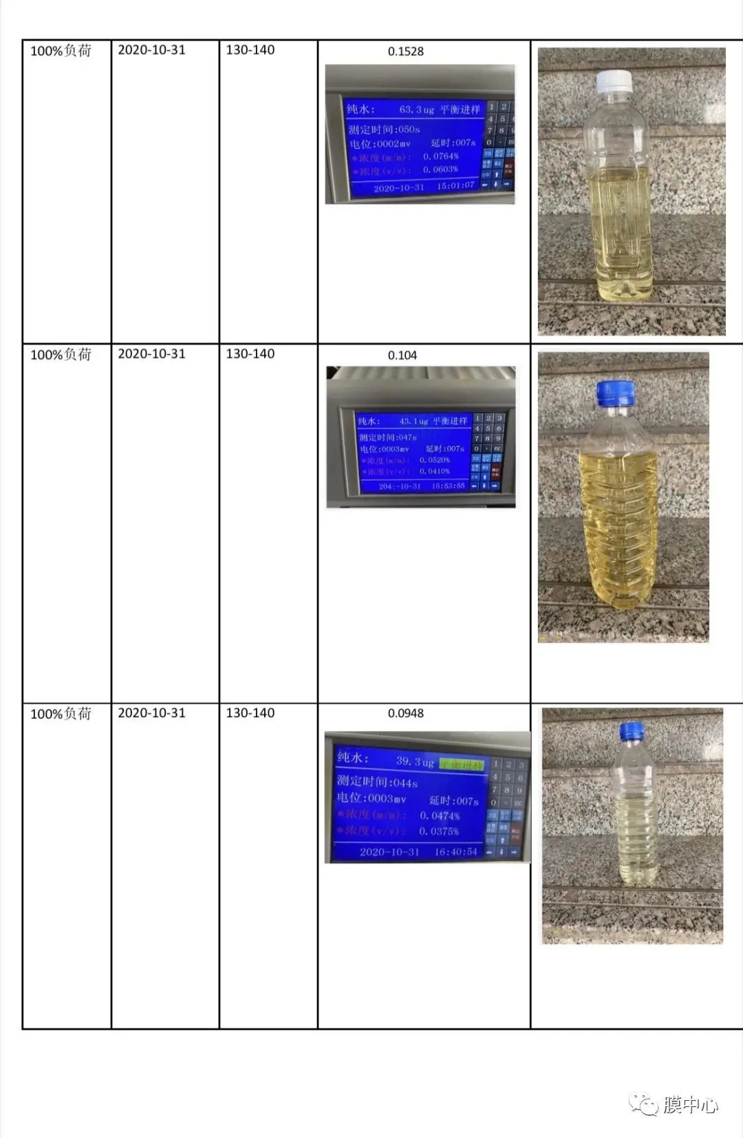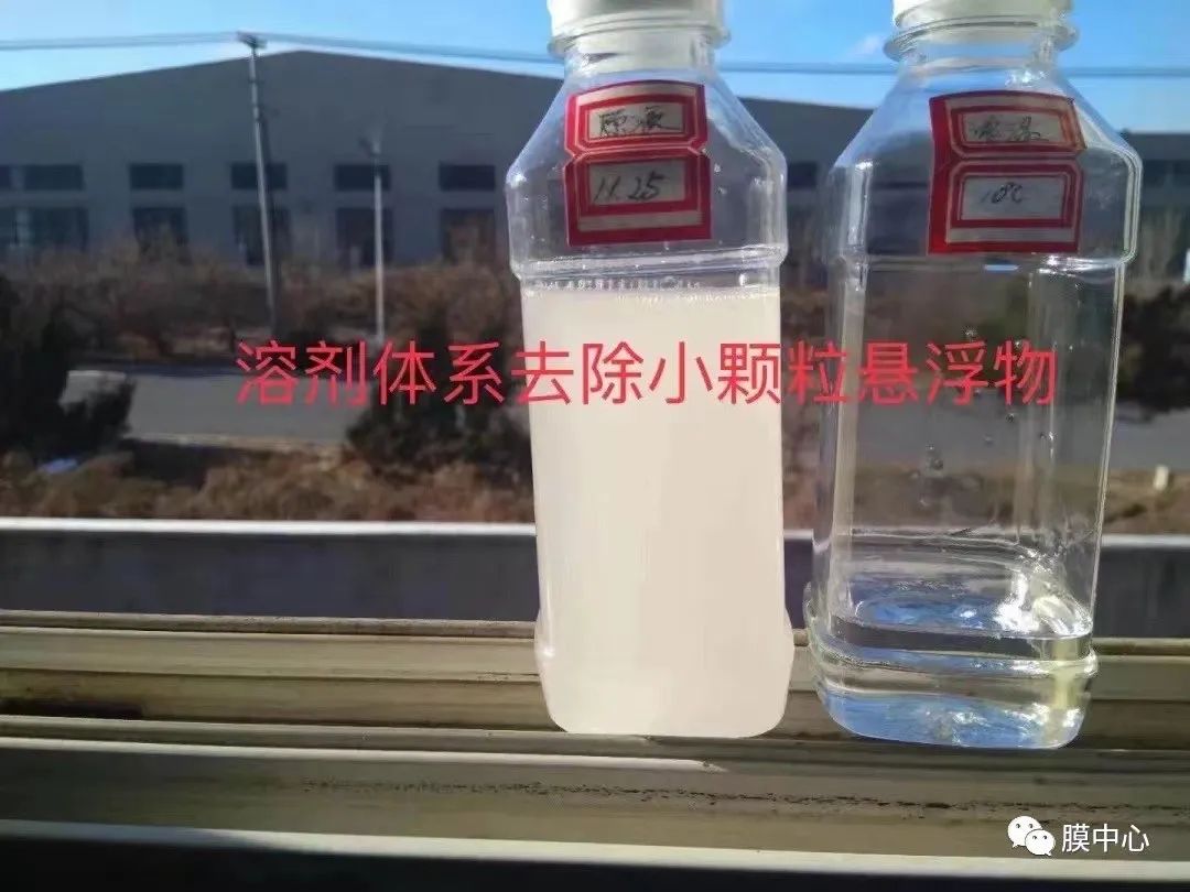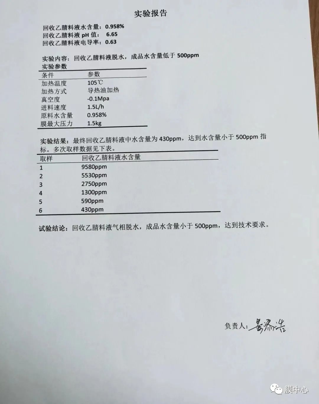 符合进膜要求的溶剂原料通过泵定量送到膜系统,原料经过滤器、预热后进入膜分离器脱水,膜分离器由若干个膜组件组成,水分子选择性透过膜,并通过真空系统收集,经最后一级膜脱水后,产品溶剂中水含量合格,真空机组尾气通过尾冷凝器将少量水汽冷却,并存储于储罐,无新增污染产生、/p>