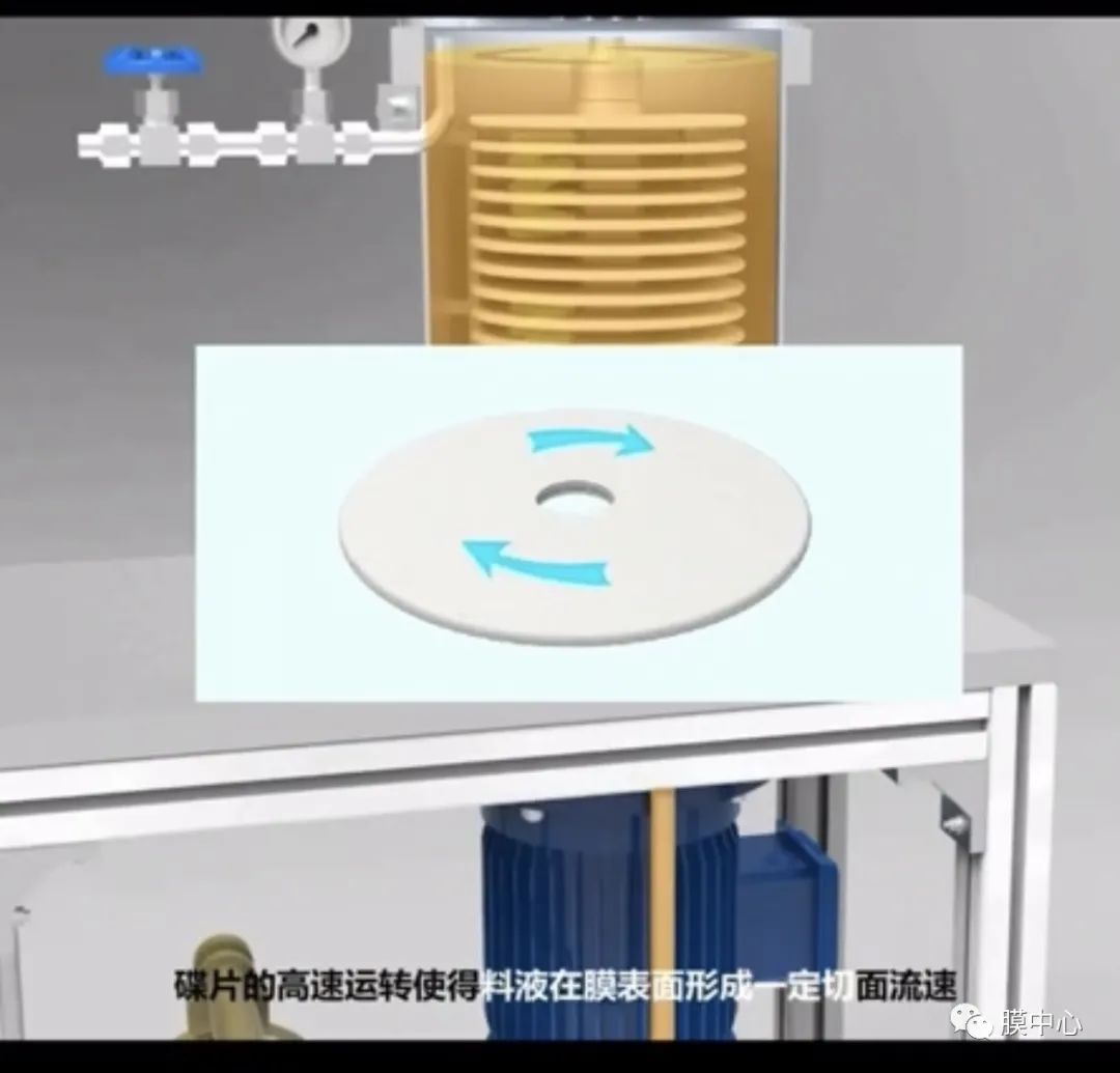 在泵和压?2-3kg)的作用下,将高粘度, 浓度物料打进膜组件做高速旋转运动,滤液 切线方式,在压力作用下穿过膜孔,通过中空 轴流出。而浓缩物(固形?由于高速旋转形 成湍流,不断冲刷膜片表面,防止固形物停留 在膜盘表面,从而有效的防止了膜表面污堵 保证过滤正常进行,从而起到浓缩作用、/p>