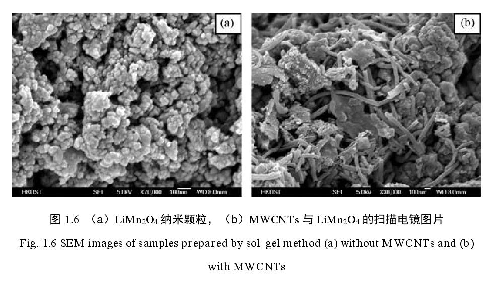Liu 等合成了 MWCNTs Li Mn2O4 纳米颗粒的复合电极材料,在扫描电镜下(图 1.6)可以看 MWCNTs