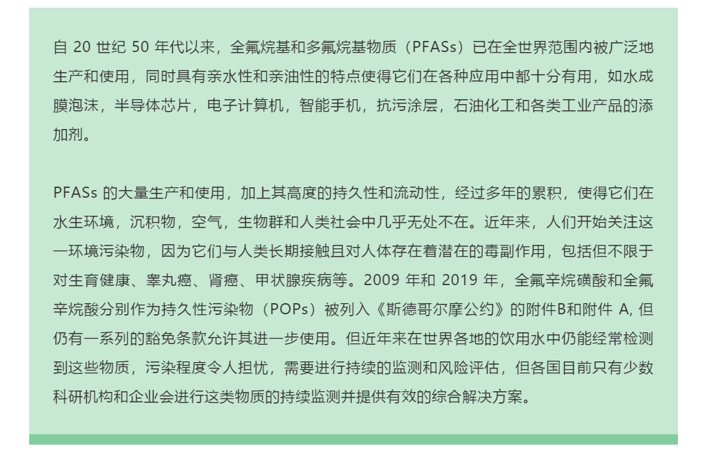 2021 1 月,清华大学环境学院环境模拟与污染控制国家重点联合实验室的一篇发表在《欧洲环境科学》期刊上的研究文章显示,根据对国 66 个大中城市,涵盖 4.52亿人口的 526 个饮用水样本中的 PFAS 进行检测,我国城市饮用水中 PFAS 含量与许多欧美国家的城市一样达到了对人体健康有影响的程度?019 年以来,包括中国、美国、欧盟在内的多个国家和国际组织已经逐步颁布了越来越多的针对 PFOS、PFAS、PFOA 等物质的限制使用条款和法律,随着这类法律的逐步颁布与完善,以及我国对环境保护事业和人民群众身体健康的日益重视,在居民饮用水中普遍造成污染 PFAS 类物质的官方及第三方检测需求在可见的未来会越来越大。对 PFAS 进行持续监测和风险评估有利于我们掌握这类物质的扩散程度和可能的危害情况,并以此为依据制定监管政策和科学研究, 从而为未来逐步控制 PFAS 的不良影响和健康威胁铺路。而这第一步就需要行之有效的 PFAS 测定方法和设备、/p>