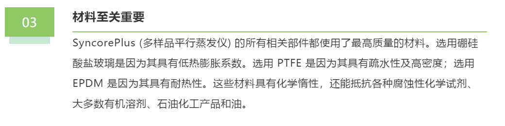 其中,我们的预分析型 SyncorePlus Analyst (多样品平行蒸发定量浓缩仪)具有三个主要特征:
