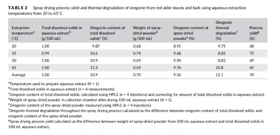上面表格中详细记录了不同提取温度下提取液的喷雾干燥产率,热降解率等、/p>