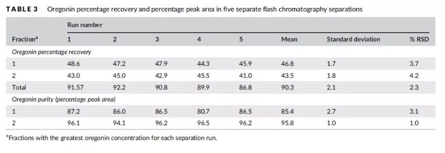 通过本研究,可以使用简单经济的水提取工艺,最大限度地减少有机溶剂的使用;喷雾干燥高效快速地去除提取溶剂,使红桤木素产率 70% 以上,降解率也控制在 10% 以内;制备色谱纯化方法验证中,各项指标的 RSD 均在规定 5% 以内,同时也可纯化得到纯度达 95% 以上的二芳基庚烷类红桤木素。可见通过改良传统萃取方法,采用喷雾干燥和制备色谱联用技术,有利于实现天然产物从小试扩大到生产工艺中、/span>