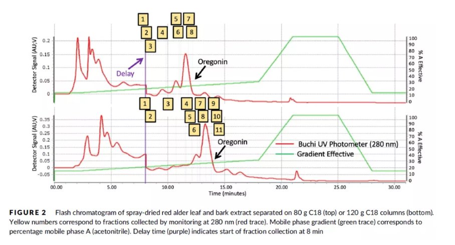 应用文献来源:Efficient purification of the diarylheptanoid oregonin from red alder (Alnus rubra) leaves and bark combining aqueous extraction, spray drying and flash-chromatography
