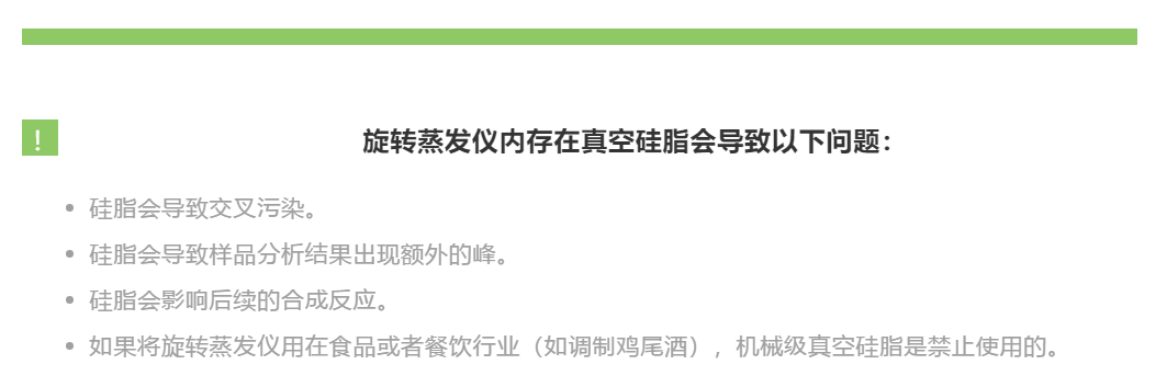 每当你进行旋转蒸发时,如果在旋塞上和玻璃接口处涂抹了真空硅脂,硅脂就会通过曝气时的回流或者从接收瓶和蒸发瓶转移液体时进入你的系统,影响样品的成分。市面上常见的真空硅脂往往是硅基润滑脂,这是一种非常容易溶解在有机溶剂中的物质。它会溶于非极性烃类溶剂的蒸汽,如戊烷、己烷、石油醚以及二氯甲烷,并且附着在玻璃内壁上、/span>