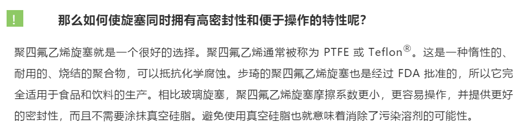 常规的市售玻璃旋塞通过表面的磨砂处理来填补玻璃件之间的缝隙,达到完全密封的效果。这样就导致旋塞旋转时阻力变大,如果强行旋转可能会出现断裂的情况。基于这种担忧,人们往往习惯涂抹真空硅脂来达到旋塞密封和润滑的效果,但这样就会出现上文所述的种种问题、/span>