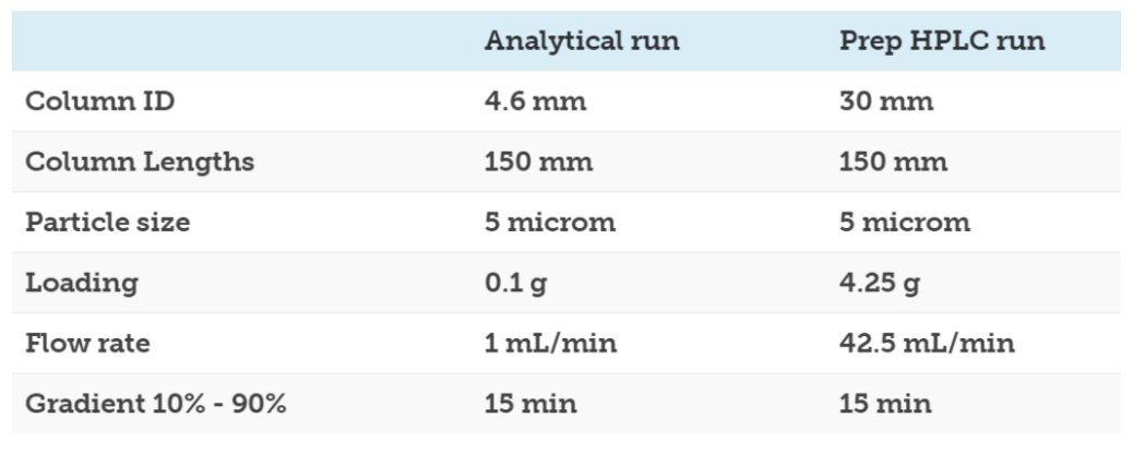 一旦您对分析结果感到满意,您可以考虑直接运用制备 HPLC 进行大量制备了。用户喜欢分析色谱的另外一个原因是,可以借助一些公式直接将分析色谱的方法转移到制备色谱上、/span>