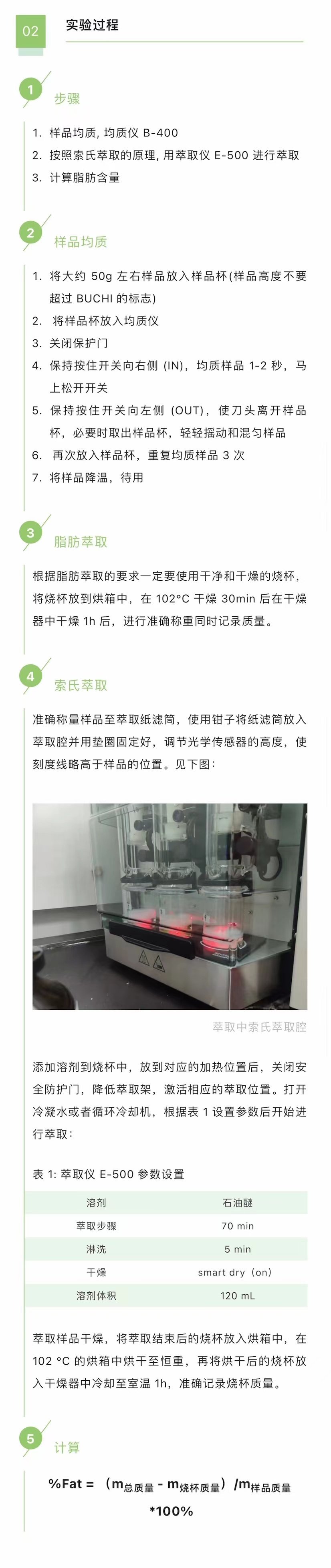 本方法是一种快速有效的萃取膨化食品中脂肪含量的测定方法,方法过程为先将样品均质后,依照索氏萃取原理使用 E-500 脂肪萃取仪进行萃取,索氏萃取是利用溶剂回流和虹吸原理,使固体物质每一次都能为纯的溶剂所萃取,萃取完成后进行干燥恒重最后通过重量法计算脂肪含量、/span>