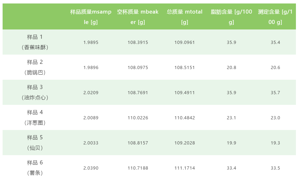 步琦脂肪萃取仪完全按照国标法进行萃取,食品中脂肪含的测定结果符合国标法要求的误差范围,同时脂肪含量高和低的样品,均可以获得较为准确的测量结果。具体结果见 2