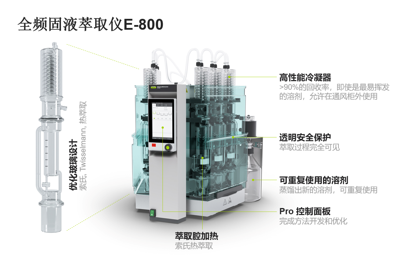 BUCHI 的全频固液萃取仪 E-800 功能强大,适合各种高要求的萃取任务,提 6 个独立的萃取位置,可以实现单独过程控制。E-800 在所有流程步骤中防止热敏分析物的变质和降解,确保萃取物的安全性和可复现性,所有接触样品和溶剂的组件均完全由惰性材料制成,可消除浸出材料造成的样品污染和任何溶剂效应的影响、/p>
