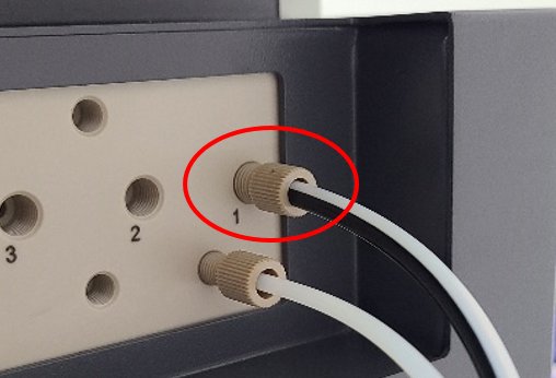 流动相管线接头的松紧会直接影响流速准确性和管路气密性,如果产生气泡,我们只需要用手尝试顺时针拧紧接头即可。流动相管线在仪器的后部,是两根管线中较粗的一根,可以参考下图的红圈、/p>