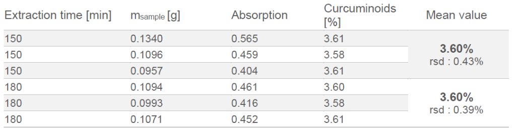 对于姜黄素的测定,姜黄样品在 2.5h (150分钟) 3 h(180分钟) 提取时间内进行三次分析。结果如?所示、/p>