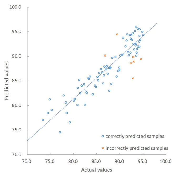 不同等级的样品分别分成两个数据集,其 185 个样品用于交互检验校正,94 个样品用于验证模型效果。建模方法分别采用了经典偏最小二乘(PLS)以及优化的区间偏最小二次(siPLS)算法。使用均方根误差(RMSE)和预测偏差比(RPD)来评价模型的预测的准确性、/span>
