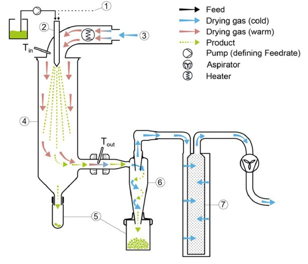 喷雾干燥是一种广泛应用的技术,可将水溶液或有机溶液、乳剂、分散剂和悬浮液转换为干粉。这是一个快速且一步完成的过程,使其在降低成本、易于扩大规模和操作方面具有优势。重要的是,对温度敏感和挥发性物质,如酶、蛋白质、抗生素、香精和香料,可以在不损失活性的情况下进行喷雾干燥。其原因是粒子在该过程中的平均停留时间仅有几秒钟、/p>