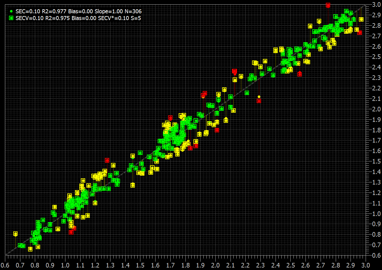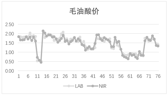 从图中可看出酸价定标模型的化学值和预测值有很好的相关性,验证集相关系数达 R2 0.975,验证集偏差 SECV 0.10,模型具有较高的稳定性和预测能力,预测效果如下图所示、/p>