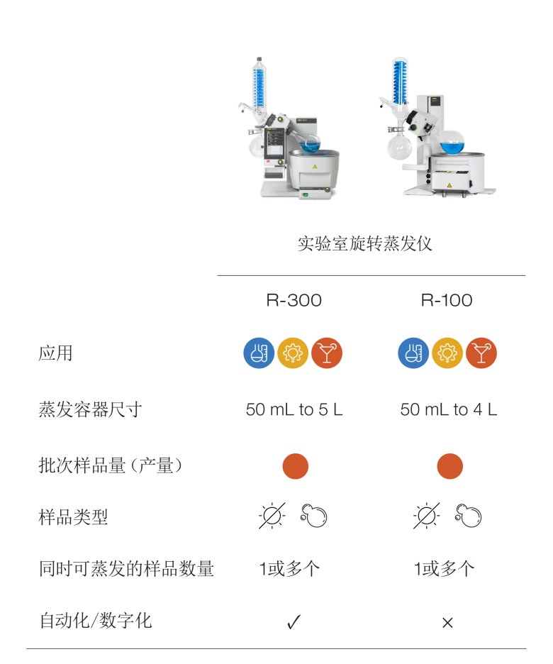 蒸发系统家族中最常使用的成员当然是实验室旋转蒸发仪。作为化学实验室的主力军,实验室级的旋转蒸发仪是蒸发和蒸馏从 20 mL 3 L 样品的理想选择。R-100 R-300 还可以处理光敏或者易起泡的样品,根据不同的配件,你甚至可以同时蒸发多个样品。你可以在检测实验室和研发实验室,以及酒吧、酒厂和分子厨房中发现他们的身影、/p>
