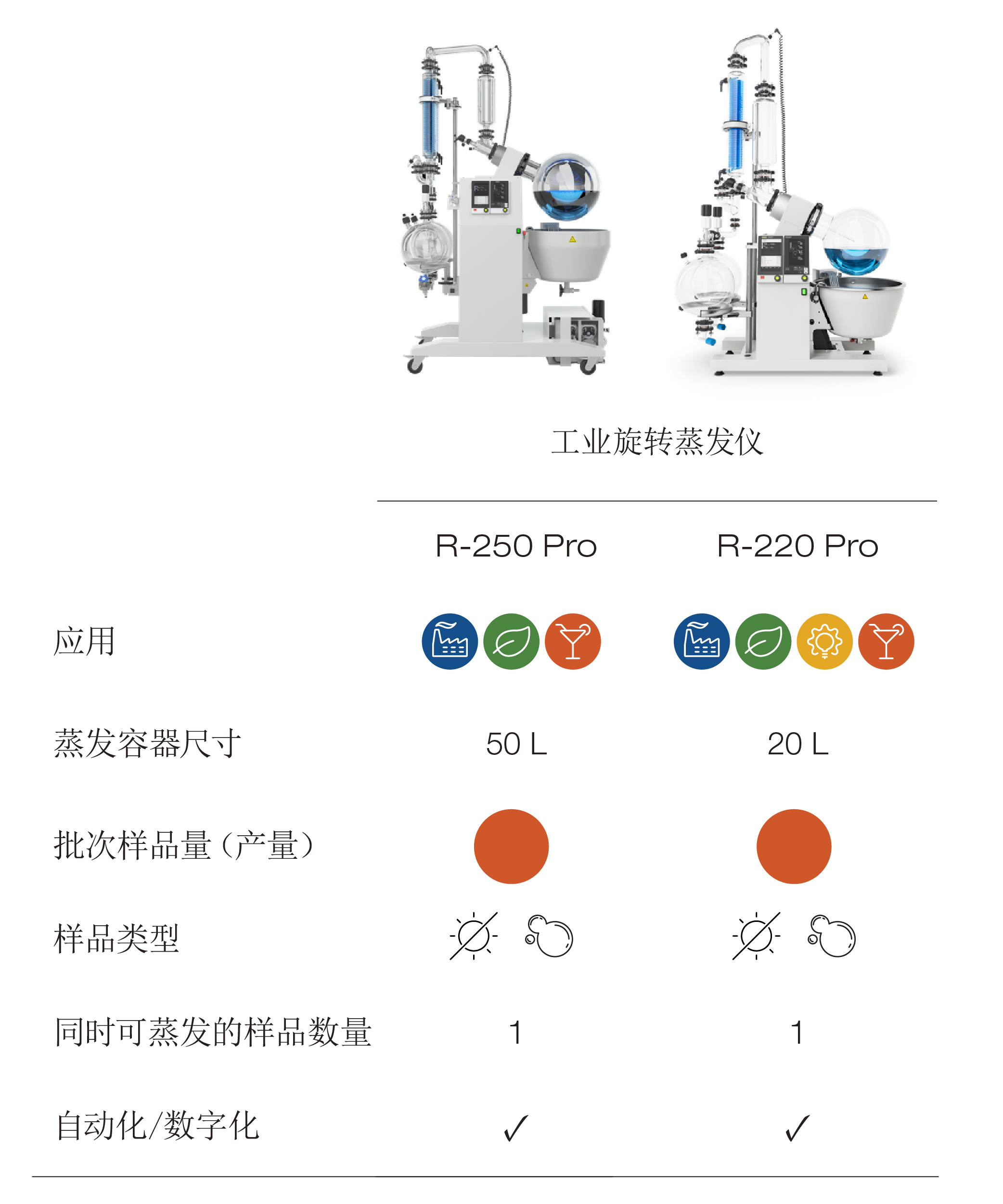 对于较大体积的样品,工业级旋转蒸发仪是完美的解决方案。R-220 Pro R-250 Pro 可以一次处 10 L 30 L 的样品溶剂,包括光敏和易起泡的样品。得益于大体积单次处理量,工业级旋转蒸发仪往往用在中试和放大工艺实验室以及工厂里。在应用方面,制药、天然产物、酒厂和香精香料都是其擅长的领域。根据不同的配件,可以实现连续自动蒸馏,或者让整机符合防爆工厂的要求,甚至可以边萃取天然产物边蒸馏!(点击这里查看(/p>