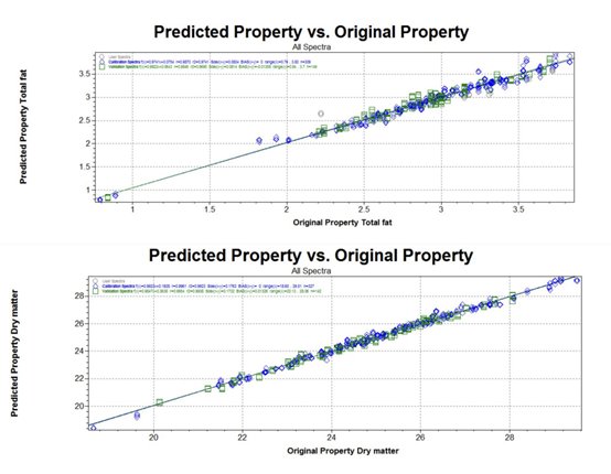 使用步琦 NIRFlex N-500 扫描 316 个样品的近红外光谱,采用盖勃法和红外分析为样品的脂肪和干物质提供参考值,二者的灵敏度分别为 0.05 % 0.1 %,所建立的近红外模型如图所示、/p>