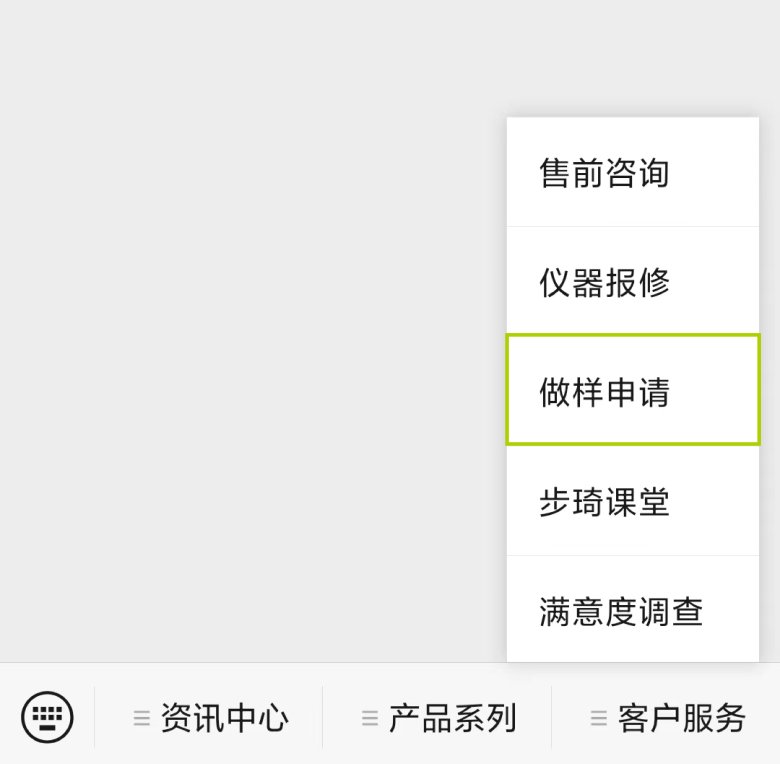 关注公众叶span style="color: rgb(165, 210, 0); box-sizing: border-box;">【步琦智慧实验室【/span>—–span style="color: rgb(165, 210, 0); box-sizing: border-box;">【客户服务【/span>—–span style="color: rgb(165, 210, 0); box-sizing: border-box;">【做样申请【/span>——选择【Pure Essential 色谱系统试用申请【/span>