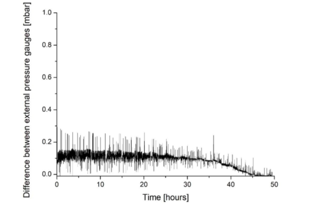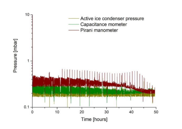 当压力设定在 0.200mbar 时,电容压力计测量的实际压力平均 0.230mbar。在干燥过程中,实验室的温度和冷冻干燥机的环境温度平均为 20.1℃、/span>?显示了甘露醇溶液在连接到歧管圆底烧瓶中冷冻干燥时的压力。皮拉尼计测得的值比电容压力计测得的值高 1.6 倍(绿色为电容压力计,红色为皮拉尼压力计)、/span>