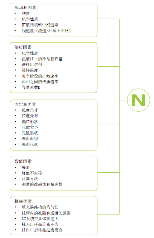 为了理解等式的第一部分(HETP),我们需要了解什么是柱色谱中的理论塔板(TP)。色谱过程的效率和分辨率与理论极板的平方根成正比。也就是说,塔板数变成四倍,分辨率就会变成两倍。因此,理论塔板表示每个吸收-解吸步骤所需的距离;那么H是代表什么呢?塔板数(N)除以柱长(L)取决于板高(H)、/p>