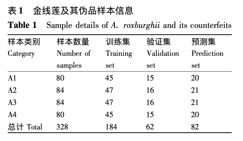 不同批次的金线莲和银线莲样品 80 批,每批 160 g。用于掺杂的斑叶兰和血液兰共计 2000g。上述样品分次清 3 5 遍,随后置于 60 °C 的烘箱中干燥至恒重,粉碎后过 60 目筛。经过处理后,纯金线莲和纯银线莲样品 80 个,掺入斑叶兰和掺入血叶兰的金线莲样品分别 84 个,共计 328 个样品、/p>