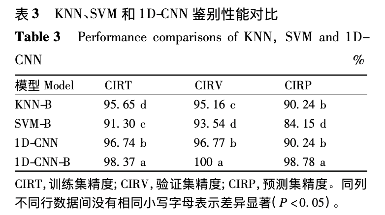 因近红外光谱数据是序列数据,随后采用一维卷积神经网络(1D-CNN)对其进行特征提取,并采用贝叶斯优化算法对CNN进行参数优化。作为对比,还分别对最近邻算法(KNN)和支持向量机(SVM)进行优化并建模验证。最终三种算法对应最优参数模型的预测精度如下表所礹