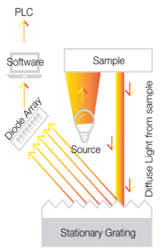 钨卤素灯不断发光,照射样品。样品的漫反射光射向色散元件 (固定光栅),产生的空间分布单色光通过二极管阵 (通常 256 个二极管组成) 进行检测。每个二极管根据其空间位置收集特定波长范围的光强。这些独立的二极管信号通常被称为像元。测得的光强 (I) 与白色参考光?nbsp; (I0) 比值,以及由像元对应的波长范围,就构成所谓光谱,?nbsp; I/I0 nm cm-1的关系图。化学计量软件根据相应模型从测量光谱中分析样品的分子性质、/p>
