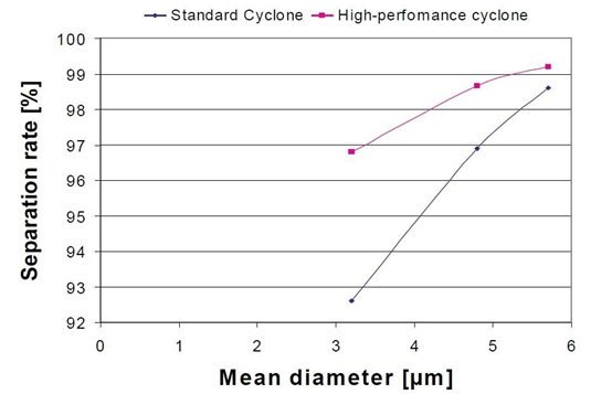 喷雾干燥过程的分离性能主要是通过测量所收集粉体的质量,并与初始重量的比值来确定的。这仅仅反映了整个过程,并没有量化旋风本身的分离能力。因此,没有在旋风中分离的粉末是通过深床聚酯纤维过滤器来测量的。将高效旋风分离器与标准旋风分离器进行了比较,它们都涂有静电涂层。将不同浓度的盐溶液进行喷雾干燥,得到不同的粒度分布,用激光衍射分析仪测量。当浓度 1% ~ 20% (w/w)时,平均直径变化 3.2 ~ 5.7 μm 之间、/p>
