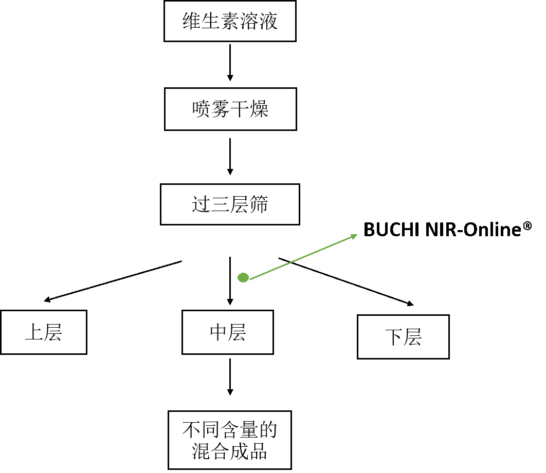 BUCHI NIR-Online® 安装在喷雾干燥之后和过筛后的位置,能?秒内测出维生素的含量和水分,且多个参数同时的连续的监控。用户依据实时结果,能实时控制产品的含量至标准范围,从而混合步骤可以省略,且平均结果比取样的某一点的结果更有代表性,因此提高了生产效率,减少了产品的次品率、/p>