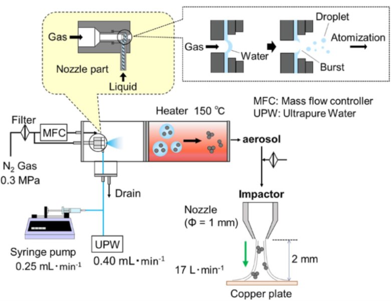 用含 AgNP 的雾化液滴制备用 SERS 测试 AgNP 微粒。实验装置示意图如图1所示。液滴雾化使用了一个定制的系统,该系统带有加压双流体喷嘴。当加压气体被引入时,液体样品通过喷嘴内出现的负压被吸入系统。在喷嘴内形成一层液体膜,然后在剪切应力的作用下分解成液滴。在雾化之前,将超纯水与 AgNPs 溶胶混合,以进一步稀释溶胶中任何浓度的潜在污染物。使用氮气作为干燥气和雾化气,将雾化后的液滴从喷嘴输送到加热区。再 4.5 L/min 的流量将 N2气体引入加热区,将雾化后的液滴加热至 150℃,促进溶剂蒸发,使 AgNP 气溶胶干燥。雾化系统总流量为 6.9 L/min,液滴停留时间为 0.93s。最后,使用定制的冲击器将干燥气溶胶形式 AgNPs 沉积在直径为 14mm 的铜制圆形基板上。撞击喷嘴直径为 1mm,因 AgNPs 17L/min 的流速加速撞击。在 SERS 实验前,将沉积的 AgNP 在常温常压下保存 24h、/p>