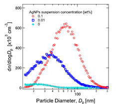 ?显示了用浓度分别 0.01wt% 0.1wt% AgNg 溶胶喷雾制备的微粒的尺寸分布。可以看到二者的平均尺寸分别约为 38nm 66nm,前者微粒的大小与纯 AgNP 颗粒(~ 30nm)的大小大致一致,这证明前者微粒中主要为纯 AgNP 颗粒。后者微粒增大可归因 AgNPs 浓度的增加,即溶胶浓度的增加。这表明 0.1wt% 溶胶喷雾干燥得到的微粒中有聚集。由此可知,用该喷雾干燥系统得到的微粒大小可通过气溶胶浓度的大小控制、/p>