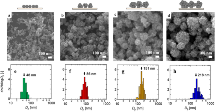 ?f?g所 3b 3c 的纳米银微粒的尺寸为 86 151nm。由 0.1wt% 溶胶制备得到的纳米银微粒形成了更大的球形聚集??d),尺寸为 218nm (?h),是气相测量中发现的 AgNP 气溶??)的两倍多。气相测量和 SEM 观察之间的这种尺寸差异可能归因于颗粒反弹效应。只有大 AgNPs 微粒才能更好地沉积,因为微粒与基底之间的接触面积较大,所以具有较高的附着力。最终使用两种浓度的溶胶 DMA,我们制备了四种不同尺寸的微粒:48?6?51 218 nm、/p>